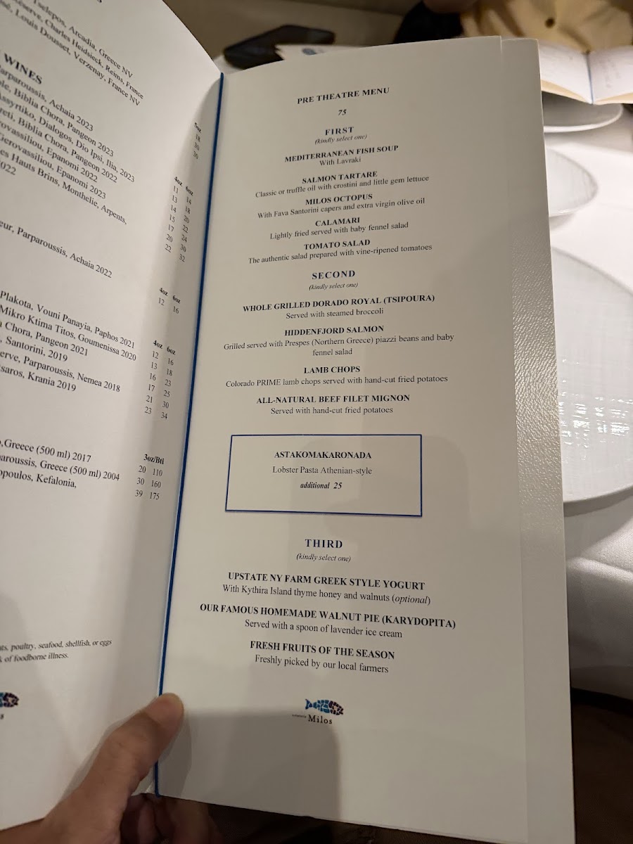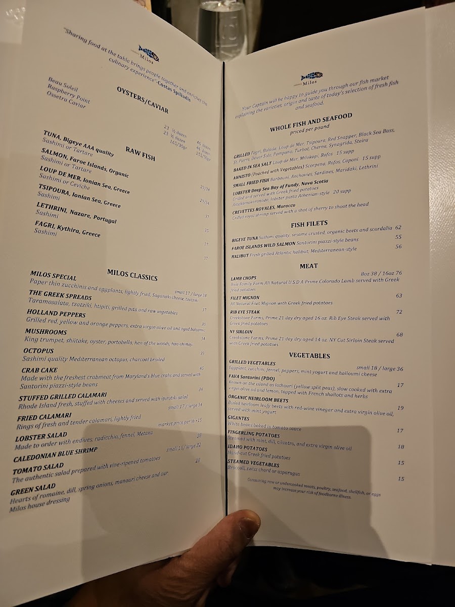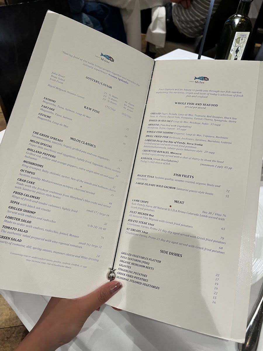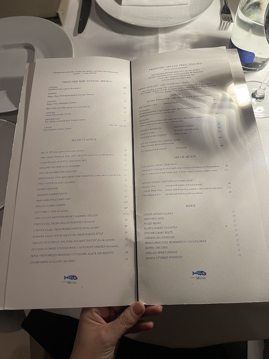 The menu at estiatorio Milos Midtown features a selection of Greek and Mediterranean dishes with an emphasis on fresh seafood. It is organized into several distinct sections to facilitate easy navigation and dining choices.